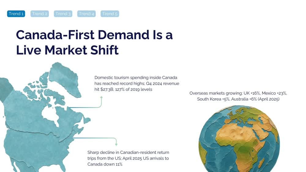 - The US-Canada trade tensions handed domestic tourism an unlikely tailwind. Canadian trips to the US fell 25% in 2025, while domestic tourism spending rose 2.7% and accommodation and dining spending jumped 5.6% for the year. Canadians travelling in our own country is now a structural trend worth planning around, not a blip.